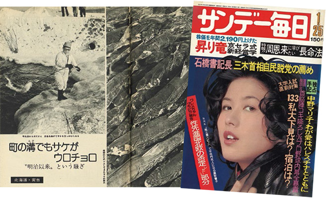 だが、50年前は記録的な豊漁だったようだ。「サンデー毎日」25日号が、いたるところにサケがあふれ返る、オホーツク沿岸の様子を伝えている。