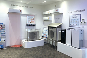 1階の「体感ショールーム」では、各種のエアコンや床暖房、給湯を展示しており、実際に体感することができる。