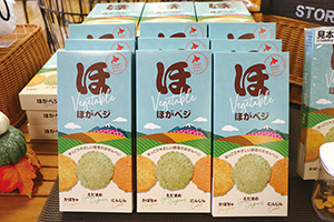 「ほがベジ3種のアソート」は、かぼちゃ、えだまめ、にんじんの道産野菜を主役にした〝ほっこりやさしい〟せんべいだ。辛味を抑え、甘みを引き立てたマイルドな味わいが特徴。3種類とも素材の風味を存分に楽しめる。