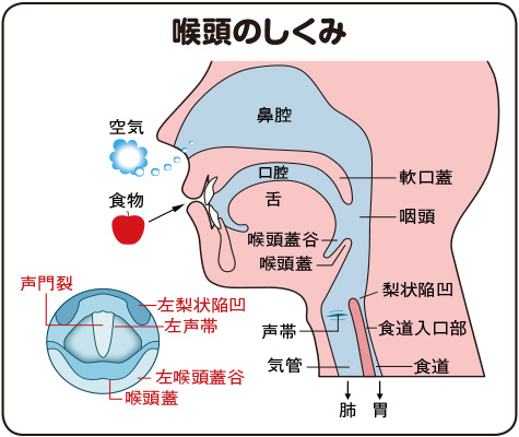 喉頭は、下方に向かって「粘膜」「筋肉」「脂肪」「軟骨」(喉ぼとけ)の順に構成されている。