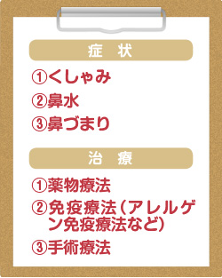 アレルギー性鼻炎は、鼻の粘膜に存在する「肥満細胞」と呼ばれる細胞からヒスタミンやロイコトリエン、トロンボキサンという化学伝達物質が放出される。ヒスタミンは鼻の神経を刺激してくしゃみと鼻水に、ロイコトリエンやトロンボキサンは血管を刺激して鼻づまりを起こす。