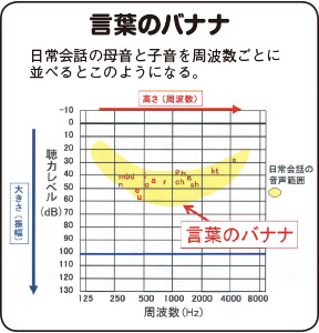 ここで参考になるのが「言葉のバナナ」(図)だ。縦軸に「言葉の大きさ」(dB)、横軸に「周波数」(Hz)を配置したグラフで、黄色い部分(バナナ)より上方なら日常会話に困らないが、下方であれば日常会話に支障が出る。