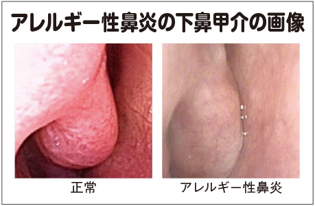 アレルギー性鼻炎の場合には、下鼻甲介が蒼白(青みかがった白っぽい色)になり、腫れて、鼻汁が透明になる。ちなみに副鼻腔炎の場合には、下鼻甲介が赤くなり、鼻汁は膿性になる。