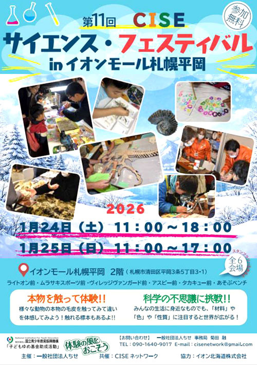 イオン北海道(本社・札幌市)が1月24日(土)・25日(日)の2日間、イオンモール札幌平岡で第11回「CISEサイエンス・フェスティバルinイオンモール札幌平岡」を開催する。